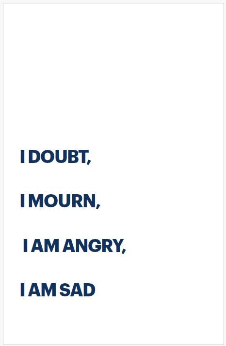 Der erste Screenshot zeigt den Impuls in blauen großen Buchstaben – I DOUBT, I MOURN, I AM ANGRY, I AM SAD