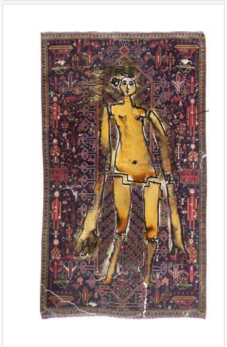 This carpet depicts a tiger, a majestic creature that has since become extinct. Tigers once inhabited the lands where my ancestors lived, symbolizing power, beauty, pride, and dignity. Over this depiction, I placed a drawing showing the shadow of a romantic relationship—a faded, blurred dream of people who might have been around. Additionally, I integrated soil from the Zagros Mountains onto the carpet, symbolizing their burial grounds.