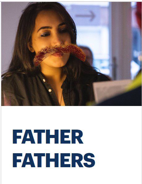 Der erste Screenshot zeigt den Artist Researcher Negin Rezaie Martos. Sie hat einen langen braunen Bart aufgeklebt. Darunter steht die Überschrift in blauen großen Buchstaben „FATHER FATHERS“ und die Details des Labors.