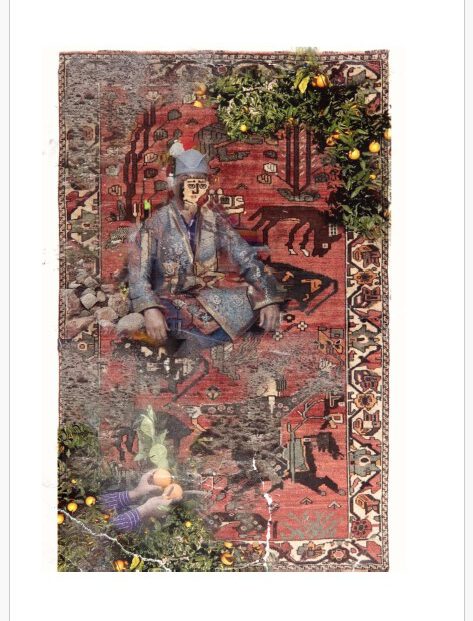The images I used are all of Qashqai carpets. These carpets typically feature figures of men and animals, with women rarely depicted. The carpet I chose tells a story of men as warriors and also reflects nature. I created a collage with this carpet. Near the center, there’s a body without a face, surrounded by orange trees and hands. I also added a faded image of the Zagros Mountains to the collage.