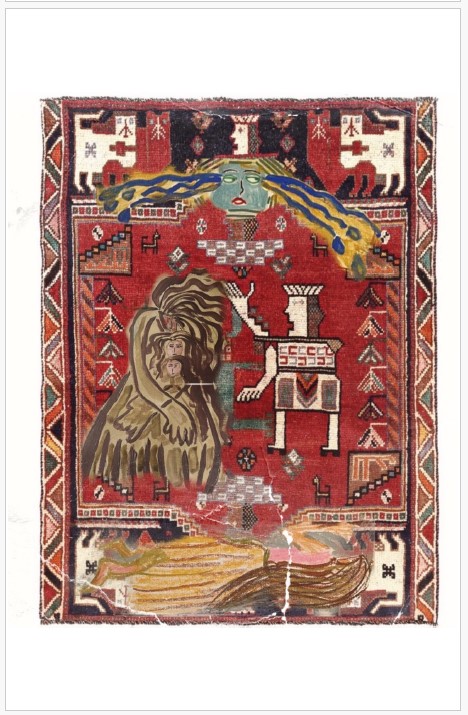 This carpet is also Qashqai. Its patterns recreate those found in Persepolis, a historic site near Shiraz dating back 2,500 years. Almost all the figures in Persepolis are male. In this carpet, a man is depicted killing a lion or another animal. I overlaid part of a drawing featuring a woman hugging two children while the man attacks. Above, the woman is shown crying, and below, she is depicted falling to the ground while people laugh at her. This contrast speaks for itself, needing no further explanation.