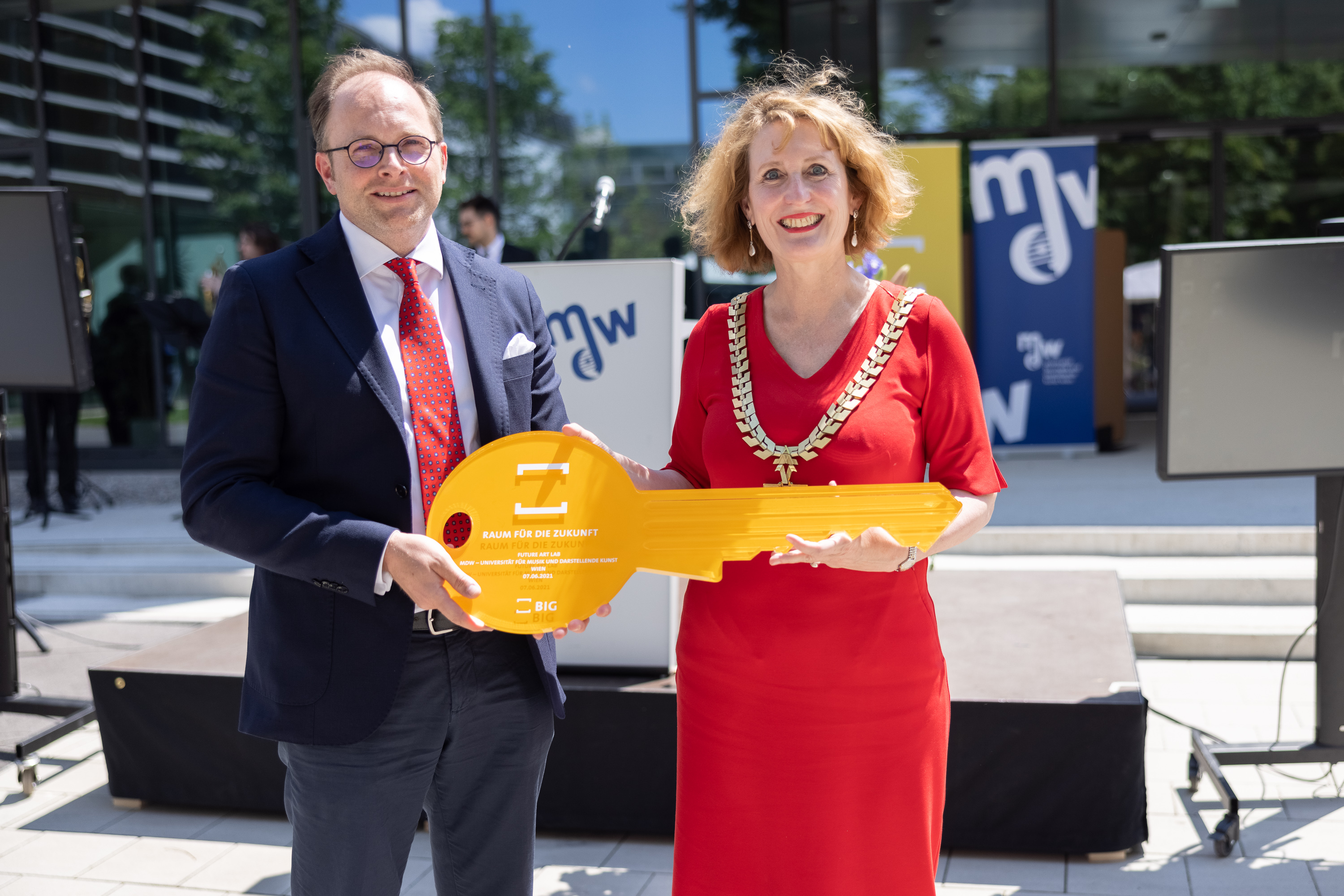 Bild: Maximilian Pammer (BIG) übergibt mdw-Rektorin Ulrike Sych den symbolischen Schlüssel für das Future Art Lab © Daniel Hinterramskogler