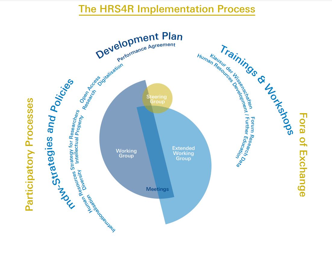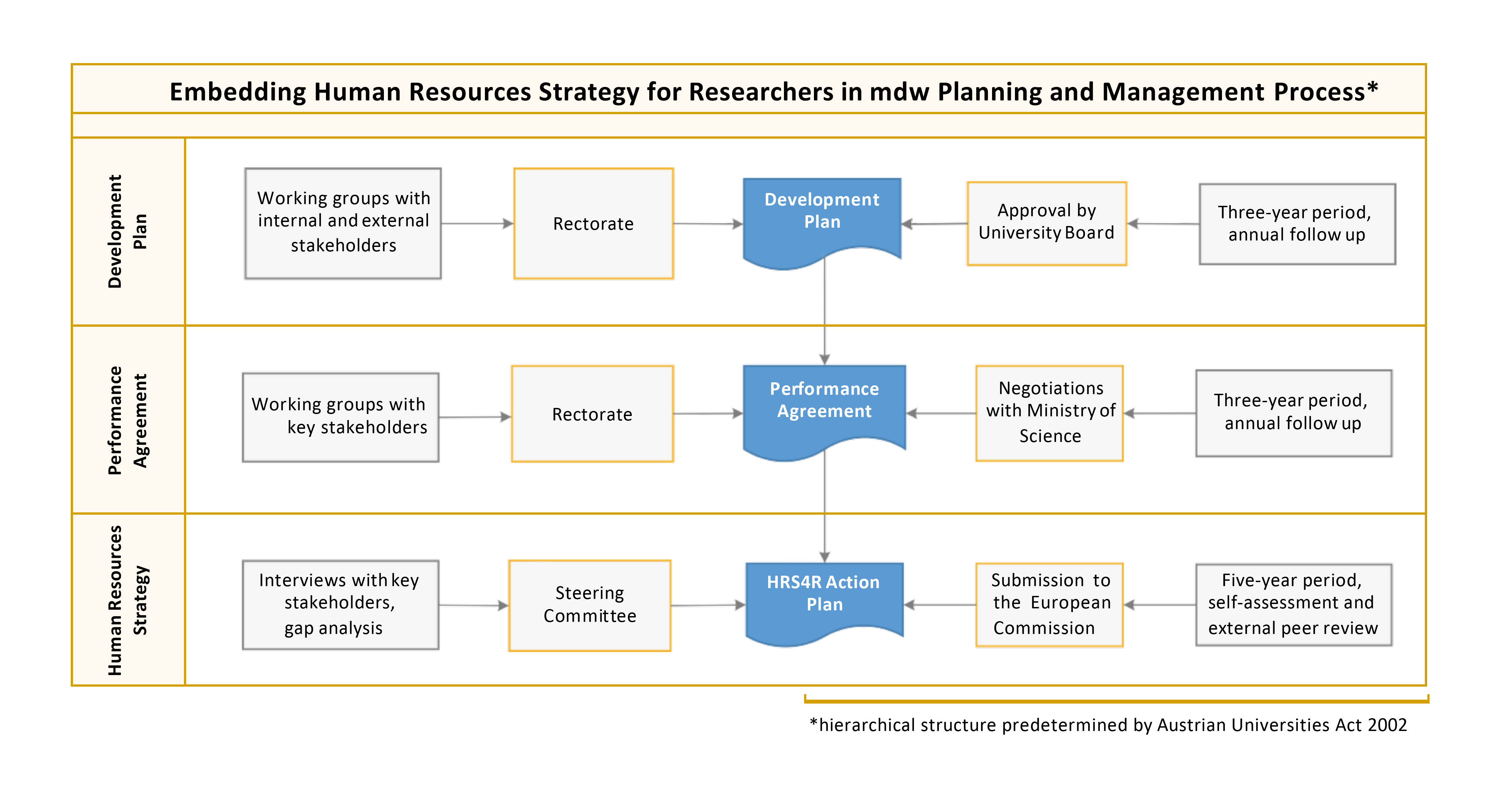Die HR-Strategie baut auf umfassenden, partizipativen Strategieentwicklungsprozessen, die in den mdw-Entwicklungsplänen 2019-2024 und 2025-2030 verankert sind, auf. Unter Einbindung aller betroffenen Personengruppen (Künstler_innen, Forschende, Studierende und Mitarbeiter_innen der Verwaltung) wurden in den Bereichen Diversität, Intellectual Property, Forschung, Internationalisierung und Digitalisierung Strategien formuliert, aus denen konkrete Vorhaben und Ziele abgeleitet wurden. Vor diesem Hintergrund ist nun die an den strategischen Zielen der mdw orientierte Ausgestaltung des HR-Maßnahmenpakets zu sehen. Der HRS4R-Implementierungsprozess baut darüber hinaus auf Ergebnissen der jährlichen „Klausur der Wissenschaften“ und anderen Austauschforen wie beispielsweise dem mdwForum Research Data auf.
