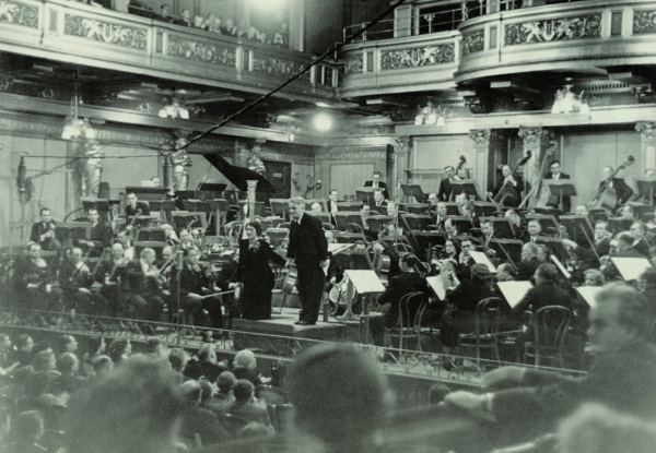 Gottfried Kassowitz, Olga Benning und das Große Rundfunkorchester der RAVAG im Großen Saal des Wiener Musikvereins 1952. Kassowitz leitete Konzerte und Aufnahmen des „Opernstudios“