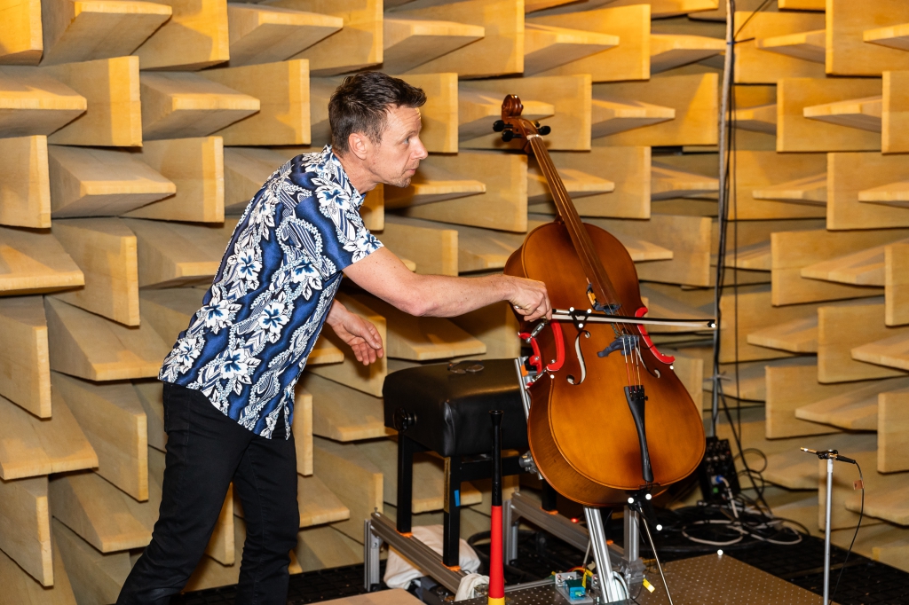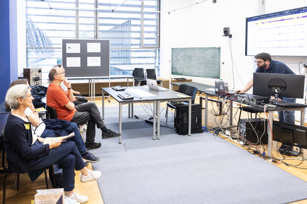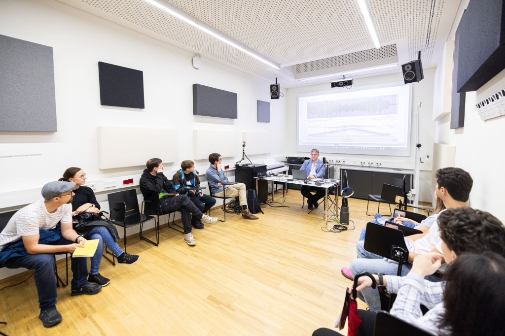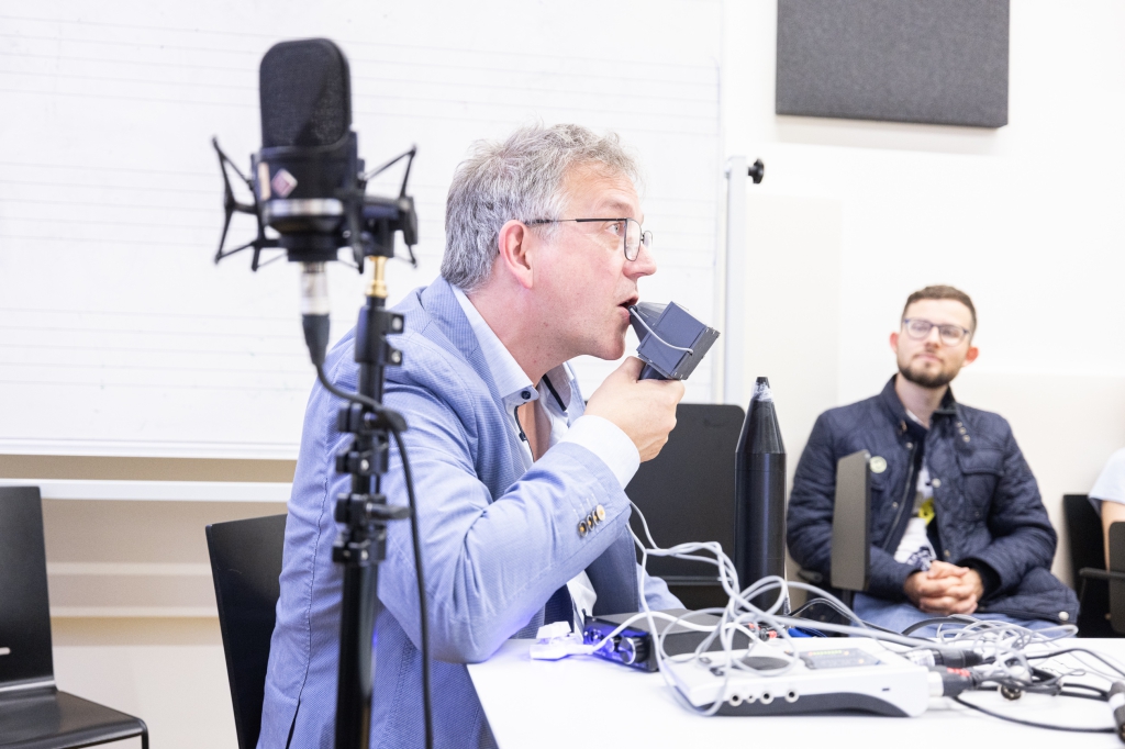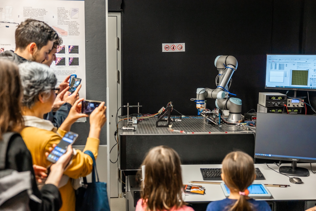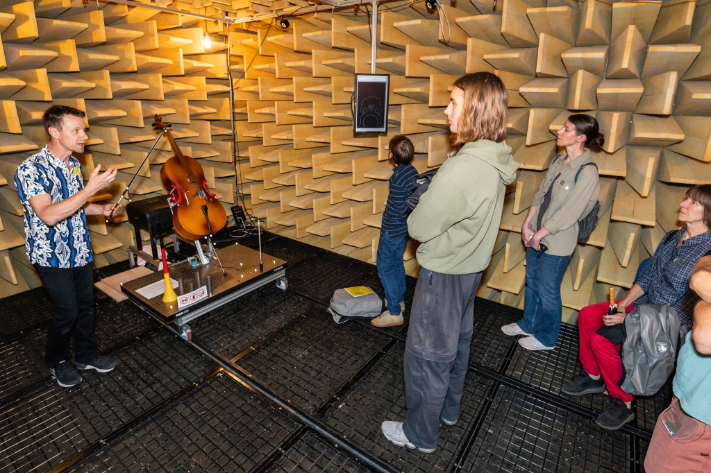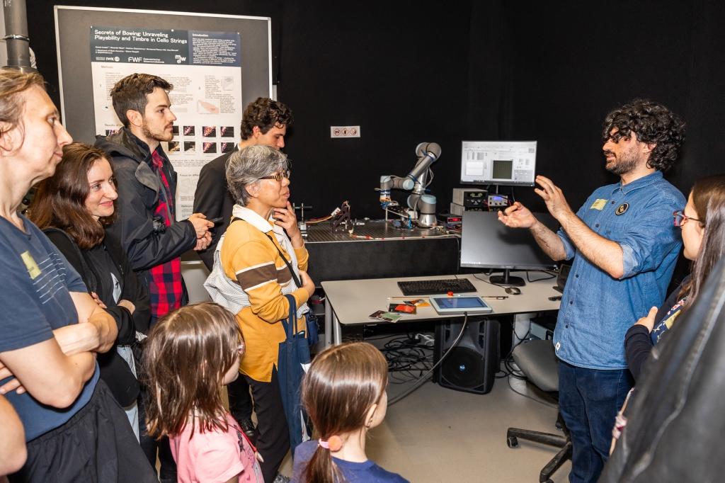 Weiter ging es zum Gebäude des Instituts für musikalische Akustik – Wiener Klangstil mit drei Stationen: In der Station „Anblasdruck auf der Posaune“ konnte ein innovatives System ausprobiert werden, das der Frage nachging, warum eine schwierige Tonpassage auf einem Blechblasinstrument manchmal besser und manchmal schlechter gelingt. An der Station „Digital Music Research“ konnten Besucher_innen in Algorithmen eintauchen und interaktive Tools von digitalen Partituren erleben. Ein Besuch im so genannten reflexionsarmen Raum wurde zu einem einzigartigen Hörerlebnis und erklärte beispielsweise, was ein Industrieroboter an einem Cello macht (Station Labor des Instituts für musikalische Akustik – Wiener Klangstil).