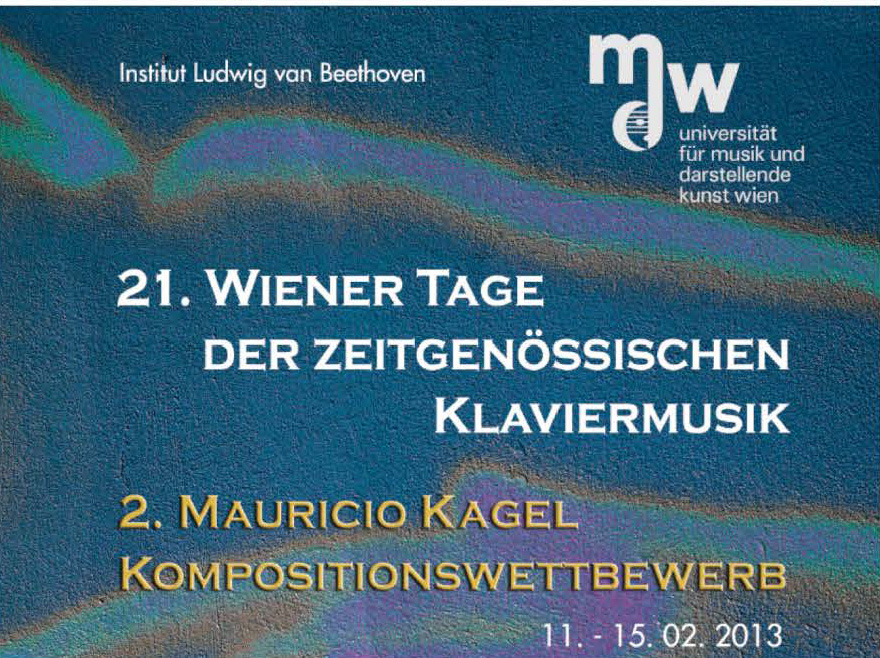 After the great success of the first edition in 2010, the mdw added the Mauricio Kagel Composition Competition of the Ludwig van Beethoven Department of Piano in Music Education to its series of regularly organised competitions. The 2nd Mauricio Kagel Composition Competition took place from 11 - 15 February 2013. The aim of the competition is the creation and dissemination of new piano works for children or young people.