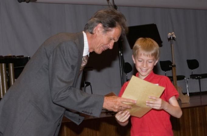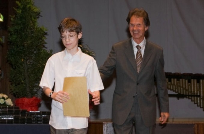 Im Anschluss an das Preisträgerkonzert des Bundeswettbewerbs "Prima la Musica" 2008 in Innsbruck übergab Prof. Max Engel die ESTA-Sonderpreise an Simon Yochanan WIENER (Violine) und Klemens KROPFITSCH (Violoncello).