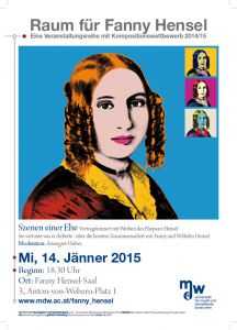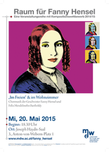 Der 210. Geburtstag von Fanny Hensel (1805 – 1847) am 14. November 2015 stellt sowohl Schluss- als auch Höhepunkt des Jahresprojektes Raum für Fanny Hensel dar. In der Matinee „Kompositorisches Experimentallabor II“ im Fanny Hensel-Saal der mdw – Universität für Musik und darstellende Kunst Wien klingt mit der Uraufführung der Wettbewerbsarbeiten sowie der beiden Auftragswerke von Alejandro del Valle-Lattanzio und Hui Ye die Veranstaltungsreihe aus.
