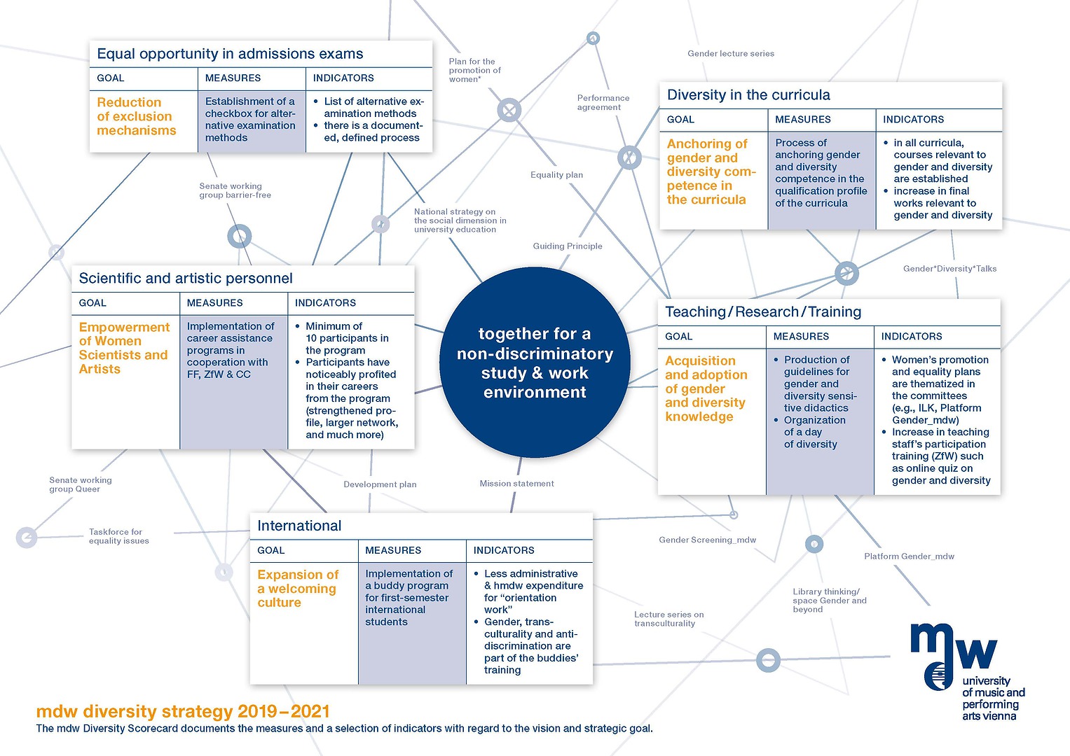 The areas of activity, objectives and related measures defined by the Diversity Strategy are detailed in the mdw Diversity Strategy Paper and the mdw Diversity Scorecard, both of which have been adopted by the rectorate. These documents guide mdw’s university-wide, diversity-oriented development in teaching, research, and administration.
