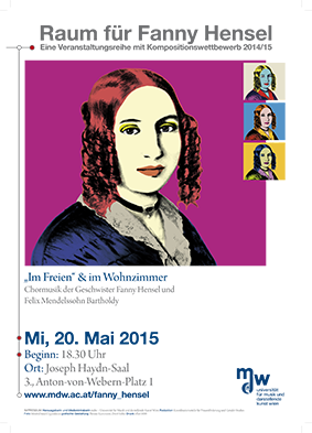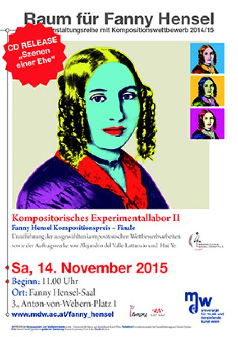 Der 210. Geburtstag von Fanny Hensel (1805 – 1847) am 14. November 2015 stellt sowohl Schluss- als auch Höhepunkt des Jahresprojektes Raum für Fanny Hensel dar. In der Matinee „Kompositorisches Experimentallabor II“ im Fanny Hensel-Saal der mdw – Universität für Musik und darstellende Kunst Wien klingt mit der Uraufführung der Wettbewerbsarbeiten sowie der beiden Auftragswerke von Alejandro del Valle-Lattanzio und Hui Ye die Veranstaltungsreihe aus.