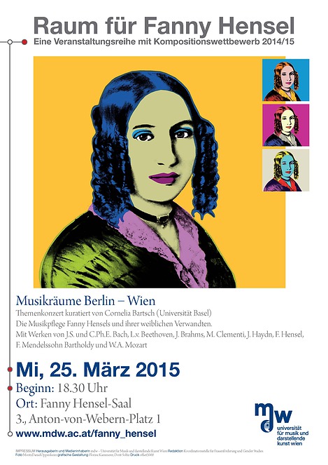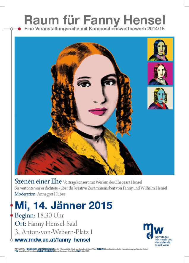 Insgesamt werden fünf moderierte Konzerte veranstaltet: Zwei – im Jänner und Mai 2015 – zeichnen jene historischen Orte und kulturellen Räume nach, in denen sich Fanny Hensel als Komponistin, Pianistin, Konzertorganisatorin und Dirigentin künstlerisch verwirklichen konnte. Sie füllen ‚ihren Raum‘ mit ihrer Musik. Das Konzert im März 2015 hingegen erinnert an das musikalische Wirken ihrer weiblichen Familienmitglieder in Berlin und Wien. Namentlich ihre Großtante Fanny von Arnstein ist für die mdw von größter Bedeutung: Sie gilt als Mitbegründerin der Gesellschaft der Musikfreunde in Wien und damit der Vorgängerinstitution der mdw – der Singschule (ab 1818 Conservatorium).