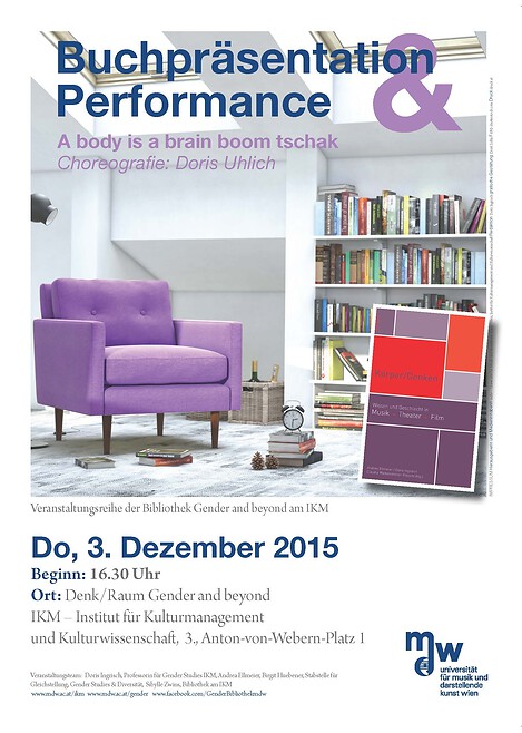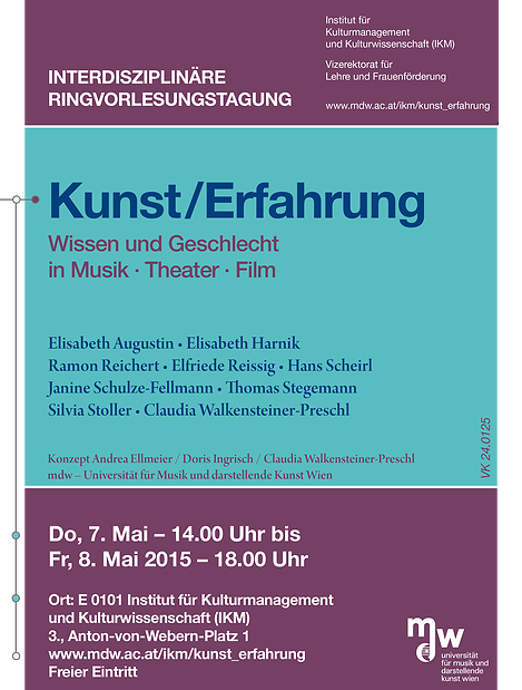Referent_innen: Claudia Walkensteiner-Preschl – Institut für Film und Fernsehen "Filmakademie Wien", mdw / Ramón Reichert – Universität Wien / Thomas Stegemann – Institut für Musik- und Bewegungserziehung sowie Musiktherapie, mdw / Elisabeth Augustin – Max Reinhardt Seminar, mdw / Elfriede Reissig – Zentrum für Genderforschung, Kunstuniversität Graz und Elisabeth Harnik – freischaffende Komponistin und Pianistin