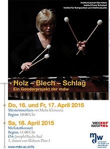 Das Genderprojekt „Holz-Blech-Schlag" der mdw - Universität für Musik und darstellende Kunst Wien verbindet Blas- und Schlaginstrumentenklassen mit den Kompositionsklassen und soll einen für Genderfragen sensibilisierenden Bewusstmachungsprozess einleiten. Im Jahr 2015 steht das Schlagwerk im Zentrum, 2013 war es die Klarinette und im Jahr 2014 die Trompete.