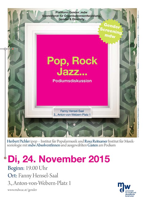 Ausgehend vom persönlichen Werdegang und der Berufskarriere von Absolvent_innen des ipop-Instituts der mdw wird über Popularmusik und Gender diskutiert. Es geht einerseits um den Anspruch der gleichberechtigten Teilhabe an Song_Writing (Text und Musik) und Performance, andererseits um die nach wie vor ungleich verteilten Möglichkeiten. Beleuchtet werden die Programmierung von Veranstaltungsorten (Musiker- und Musikerinnenquote) und Netzwerke in der Popularmusik. Seit wann können welche Instrumente im Fach „Popularmusik“ an der mdw studiert werden?