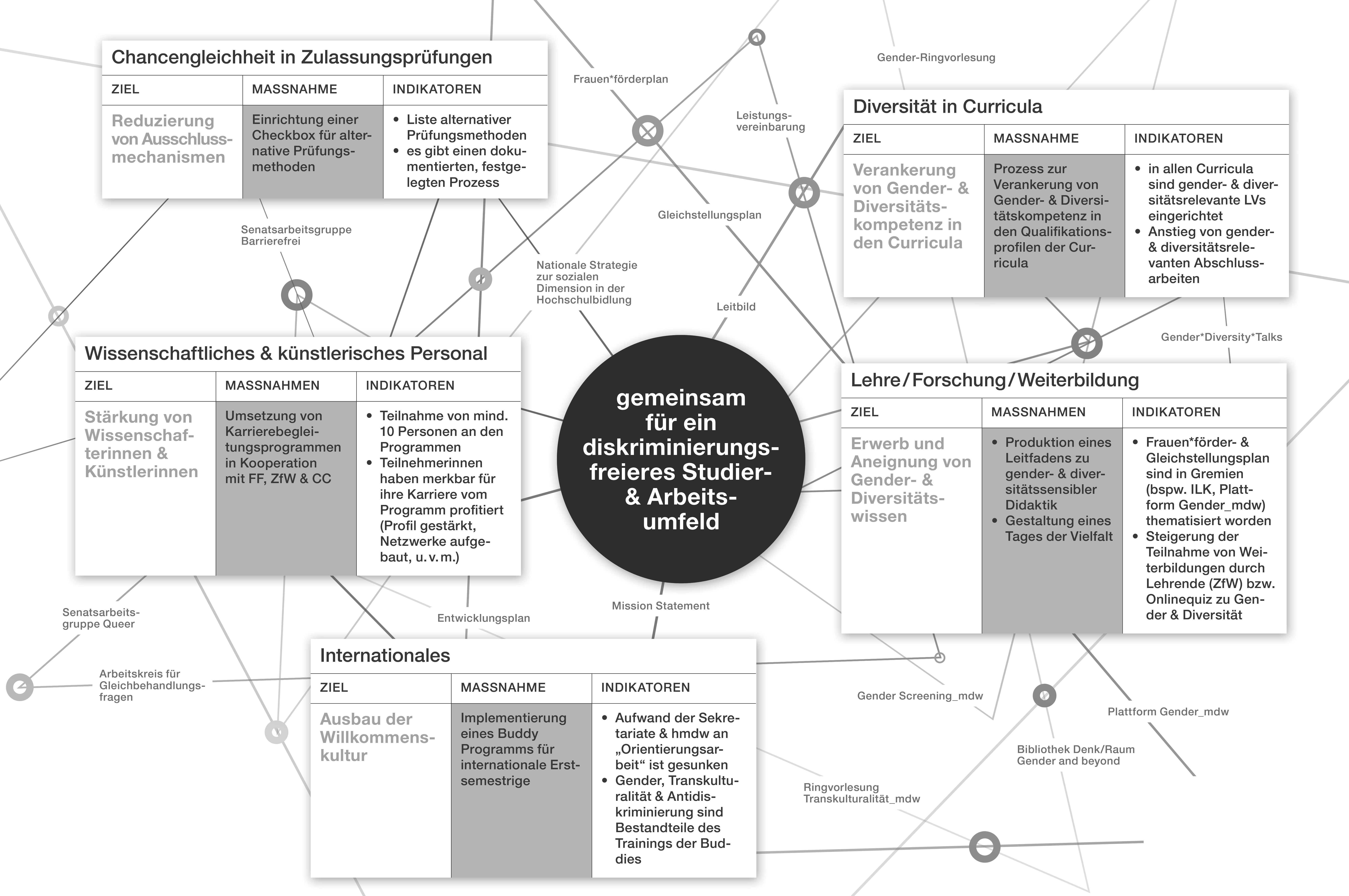 Das mdw-Diversitätsstrategiepapier sowie die mdw Diversity Scorecard umfassen die in der Diversitätsstrategie gesetzten Handlungsfelder, Ziele und dazugehörenden Maßnahmen und wurden vom Rektorat verabschiedet. Sie sind handlungsleitend für die gesamtuniversitäre diversitätsorientierte Weiterentwicklung der mdw in den Bereichen Lehre, Forschung und Verwaltung.