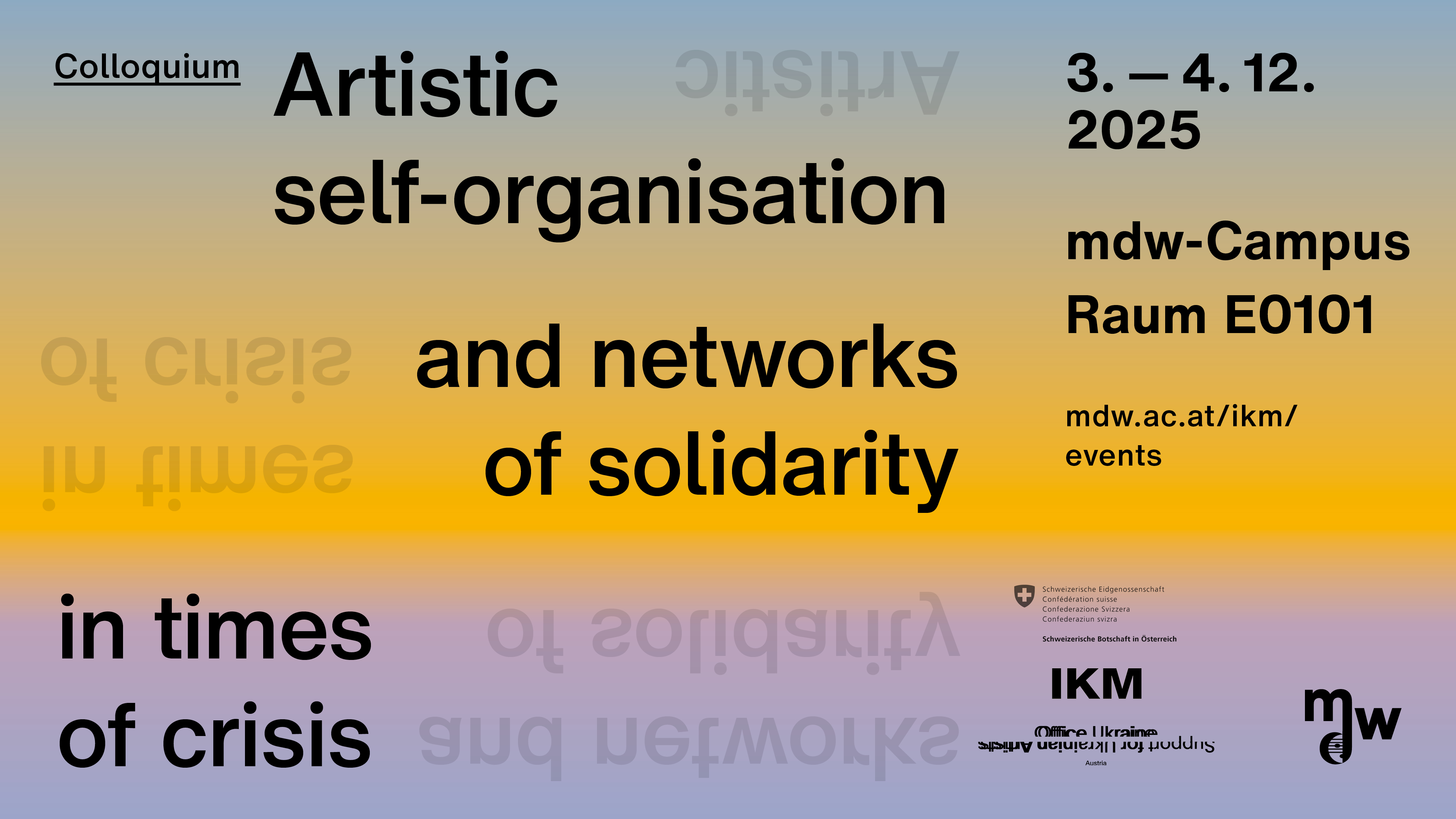 At the colloquium “Artistic self-organisation and networks of solidarity in times of crisis” we will address important issues of artistic self-organisation, in particular by illuminating questions of (forced) mobility. Today, a growing number of artists are forced to leave their homes and are displaced elsewhere because of wars, conflicts, political persecution or economic crises. Since Russia’s full-scale invasion of Ukraine in 2022, many artists from Ukraine have taken refuge in other (European) countries. In the Middle East and Central Asia, numerous people have been forced to migrate, including artists from Syria and Afghanistan, because of massive state repression, civil wars, and collective violence. Also, a number of artists are living in exile from various other countries with authoritarian or totalitarian regimes, where their livelihoods and creative activities are threatened. We are particularly interested in the situation of artists and cultural workers who are at risk, and in the question of what artistic self-organisation and space means in exile and in times of war and crisis. Through this colloquium, we will explore the relevance, enabling conditions, and challenges of self-organisation by and with artists in exile, based on examples from Austria, Ukraine, and other countries. We will also discuss concrete ideas and proposals for the development of alliances, mutual learning, collective self-advocacy, and supportive cultural policies.