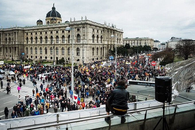 Über 12.000 Menschen nahmen am 16. März 2019 in Wien an der Demo #aufstehn gegen Rassismus der Plattform für eine menschliche Asylpolitik teil. Am Balkon des Volkstheaters las Schauspieler Christoph Rothenbuchner Texte des Architekten der österreichischen Verfassung Hans Kelsen aus dem Stück „Verteidigung der Demokratie“ von Musikerin Eva Jantschitsch und Regisseurin Christine Eder. https://menschliche-asylpolitik.at/grossdemo-in-wien-12-000-standen-auf-gegen-rassismus/