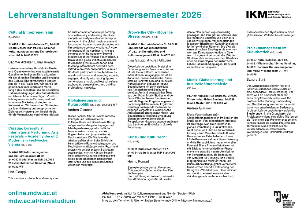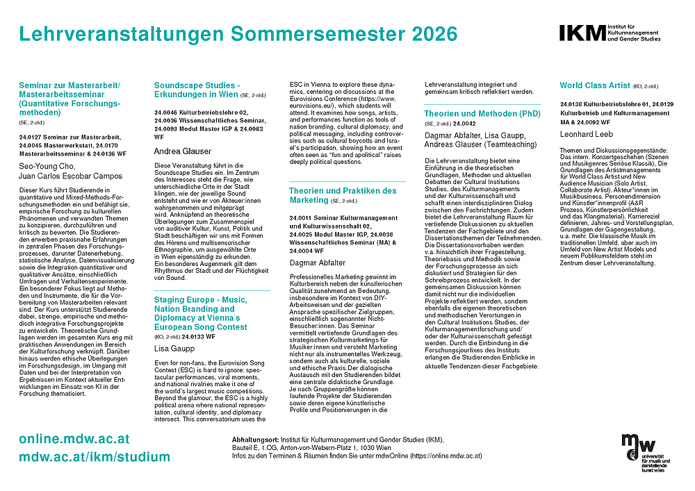 Das IKM bietet Pflicht- bzw. Wahlpflichtfächer für folgende Studienrichtungen der mdw – Universität für Musik und darstellende Kunst Wien: