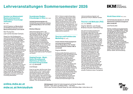 Studierende aller Studienrichtungen der mdw können unsere Lehrveranstaltungen als Wahlfach belegen. Details zur Anrechnung entnehmen sie bitte der Wahlfach-Plattform der mdw.
