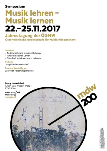 Die Jahrestagung der Österreichischen Gesellschaft für Musikwissenschaft (ÖGMW) fand 2017 an der mdw statt und beschäftigte sich, passend zum Jubiläum der mdw, mit dem Thema „Musik lehren – Musik lernen“ auf. Im Fokus standen dabei in historischen Längs- und kulturellen Querschnitten drei thematische Schwerpunkte: (1) Autodidaktisches Lernen, (2) Orte des Musiklernens und –lehrens, und (3) Traditionsbildung in oralen Musikkulturen. Posterpräsentationen zu laufenden Forschungsprojekten sowie ein Podium für Nachwuchswissenschaftler_innen „Junge Musikwissenschaft“ rundeten die Veranstaltung ab. Für Masterstudierende aller österreichischen Universitäten wurde ein begleitendes Seminar angeboten.
