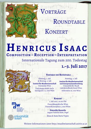 Ziel der Tagung im 500. Todesjahr war es nicht nur des internationalen Komponisten Heinrich Isaac zu gedenken, sondern vor allem der in den letzten Jahren nachgelassenen Auseinandersetzung mit Isaacs Schaffen einen neuen Impuls zu geben und die Bedeutung für das österreichische Kaiserhaus wie auch für die internationale Musikproduktion des 15. und 16. Jahrhunderts zu diskutieren. Im Sinne eines „musical mapping“ wurde ein breit gefächertes Bild der Werke Isaacs skizziert, das auf mannigfaltige Weise ein Nachdenken über zentrale Quellenkomplexe, Ereignisse, Werke, Personen und Rezeptionsphänomene erlaubt.