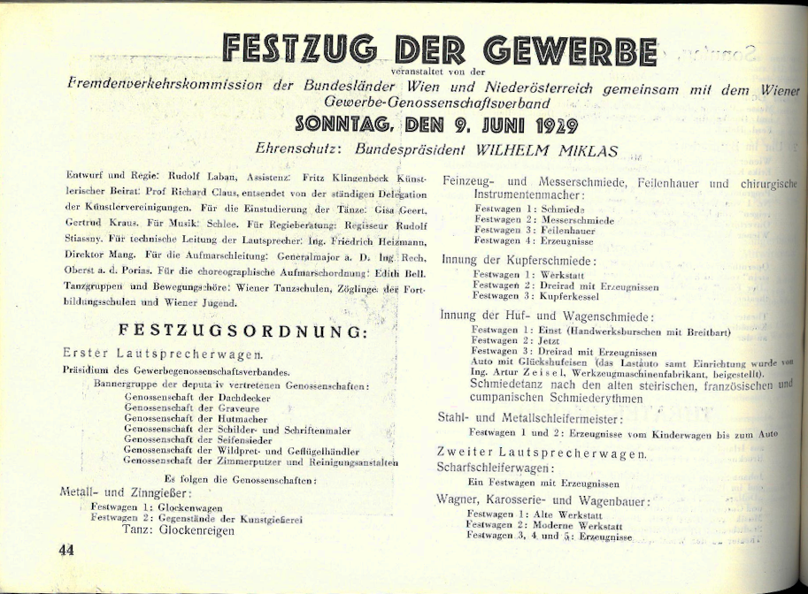 Aufgrund der außerordentlichen Anzahl an Beiträgen in der Festschrift wird deutlich, dass mit dem Festzug der Gewerbe am 09.06.1929 ein herausragendes Ereignis geplant war, wo sich unter der Leitung des Tanzpädagogen, Choreografen und Theoretikers Rudolf Laban ca. 10.000 Gewerbetreibende, Meister und Gesellen mit großen Festwägen vom Wiener Rathaus bis zum Prater bewegten. Für den Festzug wurde eigens Musik komponiert, welche durch Lautsprecher, die auf Wägen montiert waren, auf den Straßen Wiens erklangen.