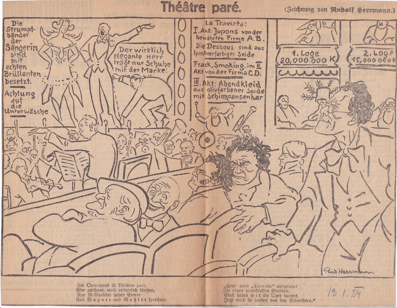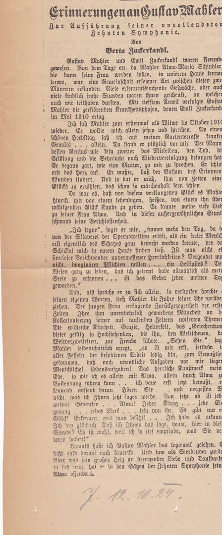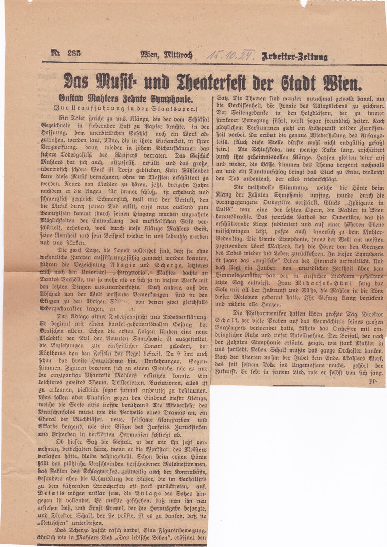 Im wunderschönen Monat Mai wurde ein Umschlag bei uns abgegeben, dessen Herkunft ungeklärt bleiben muss. Es handelt sich dabei um Dokumente zum Umfeld der Wiener Erstaufführungen von Teilen der 10. Symphonie Gustav Mahlers 1924. Eine umfangreiche Sammlung von Zeitungsausschnitten zum Thema dominiert darin, ergänzt um ein Exemplar der "Einführenden Bemerkungen" zu Mahlers "nachgelassener" Symphonie. Eine Karikatur bezeugt das große öffentliche Interesse, dass die Wiener Staatsoper (bekanntlich der Schauplatz jener denkwürdigen Aufführung) in diesem Jahr aus nicht immer nur musikalischen Gründen gefunden hat.