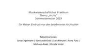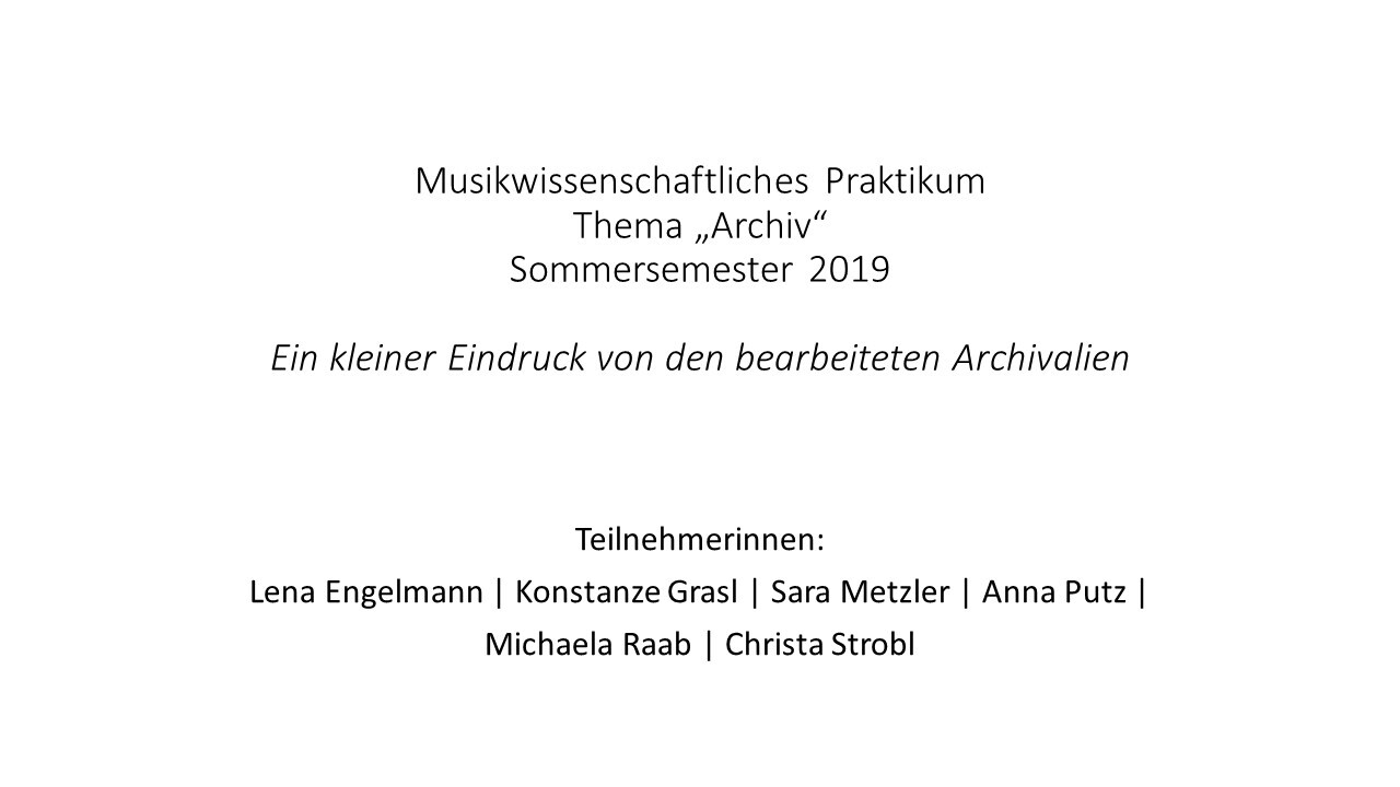 Im Sommersemester 2019 fand ein Archivpraktikum unter der Leitung von Christian Glanz als Angebot im Studienplan Musikerziehenung statt. Die folgende Präsentation gibt einen kleinen Einblick in die bearbeiteten Archivalien.