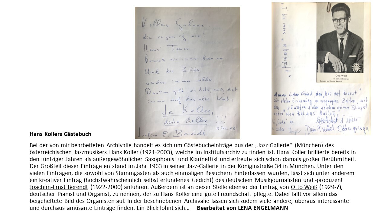 Im umfangreichen Nachlass des Jazzhistorikers Klaus Schulz (1940-2016) im Institutsarchiv („Sammlung Schulz“) sind Leben und Werk von Hans Koller (1921-2003) ausführlich dokumentiert. Als langjähriger Begleiter (de facto „Privatsekretär“) seines „Lebensmenschen“ Hans Koller hat Schulz 2007 eine Koller-Monographie vorgelegt. Koller, der wohl der erste österreichische Jazzmusiker war, der den Schritt in die internationale Szene mit anhaltendem Erfolg unternommen hat und seinerseits nicht nur für Generationen von Saxophonist_innen stilprägend wurde, hat die Entwicklung des modernen Jazz maßgeblich mitgestaltet, er gehörte zu jenen Innovatoren, deren Ideen bis heute aktuell sind.