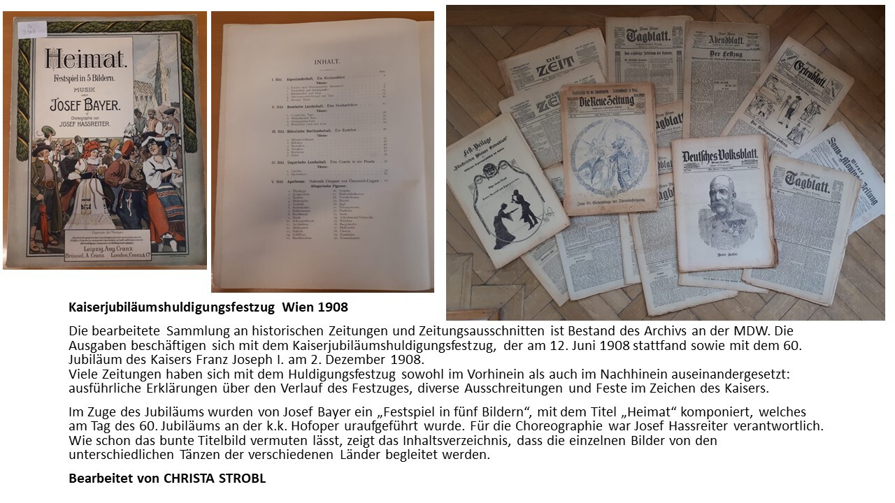 Die vorliegende Archivalie zeigt nicht nur den Aufbau des Festzuges und einige Wagenskizzen, sondern bringt auch einen Text von Rudolf Laban selbst, Texte über Johann Strauss, die Stadt Wien sowie einen Text, der die politische Absicht des Zuges beschreibt.