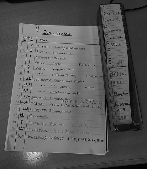 Um der Frage nachzugehen, welche Rolle dieser Fotoapparat in einem musikwissenschaftlichen Institut gespielt hat, bedarf es eines Rückblicks auf die Lehre nicht lang vergangener Zeiten: Heute mag es selbstverständlich erscheinen, nach Klang- und Bildbeispielen für den Unterricht im Internet zu suchen – in den 1970er und 1980er Jahren war das nicht so einfach. Klangbeispiele erklangen im besten Fall von LPs, sonst von viel aufwendiger zu bedienenden Tonbändern. Bilder wurden mittels Dias an die Wand oder auf eine Leinwand projiziert. Die im Historischen Archiv des Instituts für Musikwissenschaft und Interpretationsforschung der mdw aufbewahrte Leica wurde genau für diesen Zweck angeschafft. Ihre Seriennummer (M4 –1213440) ermöglicht ihre Datierung (1968-1969) und das Eingrenzen des Zeitraums ihres Ankaufs.