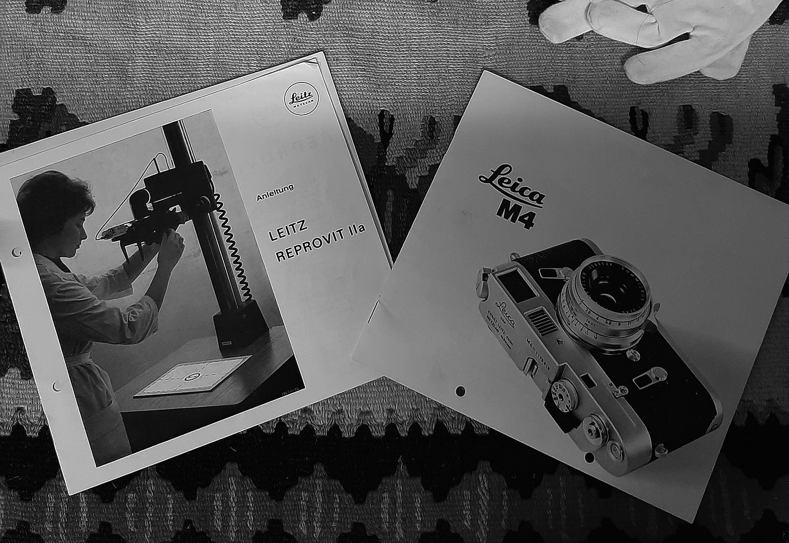 Neben dem Gehäuse wurden im selben Kontext auch zwei Objektive (Leitz Wetzlar Summicron 1:2/50 und Leitz Wetzlar Colorplan 1:2.5/90mm) gefunden und in die Historische Sammlung aufgenommen. Vom Leitz Reprovit IIa, einem komplexen Schiebebühnensystem, in dem man die Kamera hineingestellt hat, um Bücher und andere Vorlagen zu fotografieren (eine Tätigkeit, die von den Sekretär*innen und Assistent*innen des Instituts durchgeführt wurde), ist leider nur mehr die Gebrauchsanleitung erhalten.
