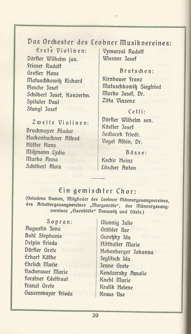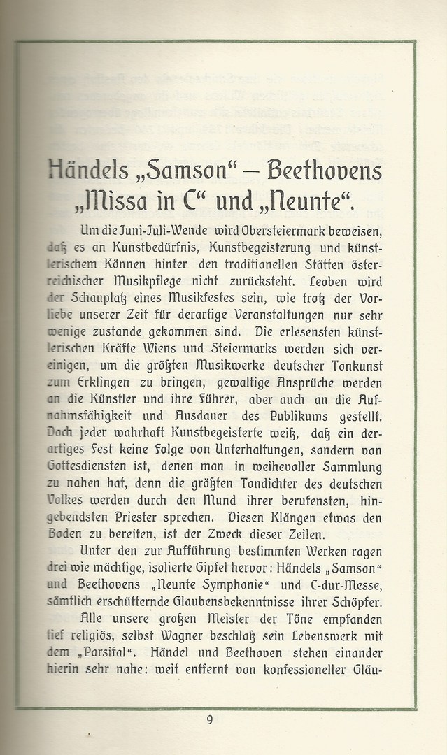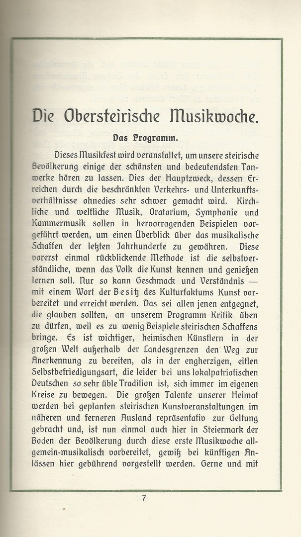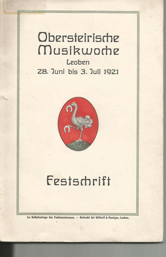 Die vorliegende Festschrift entstand anlässlich der Obersteirischen Musikwoche, die vom 28. Juni bis 3. Juli 1921 in Leoben stattfand. Für deren Programmgestaltung waren in erster Linie der damals 27jährige Hermann Schmeidel und der 29jährige Alois Pachernegg (Leiter der Musikvereinskonzerte und der Musikschule in Leoben) verantwortlich. Ganz offensichtlich orientierten sie sich bei der Programmgestaltung an den „Meisteraufführungen Wiener Musik“, die ein Jahr zuvor stattgefunden hatten. Schmeidel hatte dabei als Dirigent mitgewirkt. Trotz des stark reduzierten Programms im Vergleich zum Wiener Vorbild, sind die Auswahlkriterien und die dahinterliegende Intention sehr ähnlich: Die Konzerte sollten in der schwierigen Nachkriegszeit als Zeichen eines gesellschaftlichen Neubeginns stehen. Der steirischen Bevölkerung wurde "Großes" geboten: Unter Beteiligung von Opern- und KonzertsängerInnen aus Wien und Graz sowie der Wiener Philharmoniker führten der Musikverein von Leoben und lokale Chöre Ouvertüren, Symphonien, Messen, Oratorien von Bach, Händel, Mozart, Haydn, Beethoven, Wagner, Goldmark, Bruckner, Mahler auf. In erster Linie handelte es sich um Komponisten, die damals als „Heroen“ der "deutschen", bzw. "deutsch-österreichischen" Musik betrachtet wurden. Dieses kulturelle Erbe, das zuvor einer elitären städtischen Bevölkerung vorbehalten war, sollte nun einem breiten Publikum dargeboten werden. Während bei den „Meisteraufführungen Wiener Musik“ vor allem an die Arbeiterschaft gedacht wurde (für das Programm war der sozialdemokratische Kulturpolitiker David Josef Bach hauptverantwortlich), dachte Hermann Schmeidel vor allem an die „Landbevölkerung“, die er in der Festschrift als die „gesunderen, unverbrauchten Menschen“ bezeichnet. Von ihr aus sollte eine „Bluterneuerung“ hervorgehen.