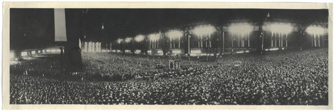 Die hier gezeigte Fotografie wurde sehr aufwendig von der Österreichischen Luftverkehr A. G. von einem erhöhten Standpunkt aus gemacht. Die Form des Panoramabildes ermöglicht eine Vorstellung von der gewaltigen Größe der damals beteiligten Menschenmasse und von der riesigen Dimension der Halle. Allein die Tribüne war für etwa 40.000 Sänger konzipiert. Sie sind hier im Vordergrund abgebildet und nehmen einen Großteil des Bildes ein. Der (Haupt)Dirigent stand auf einem Holzturm, der in der Mitte des Bildes zu sehen ist. Die Konstruktion der Halle erweckte offensichtlich großes Interesse und wurde in den Medien detailreich geschildert. Dabei wird nicht selten in Superlativen von der „größten Halle der Welt“, dem „Konstruktionswunder“, dem „Erfolg der technischen Wissenschaften“ berichtet. Besonders stolz zeigte man sich auf die neuen technischen und medialen Möglichkeiten, insbesondere auf die als Sensation empfundene direkte Rundfunkübertragung durch diverse österreichische und deutsche Sender.