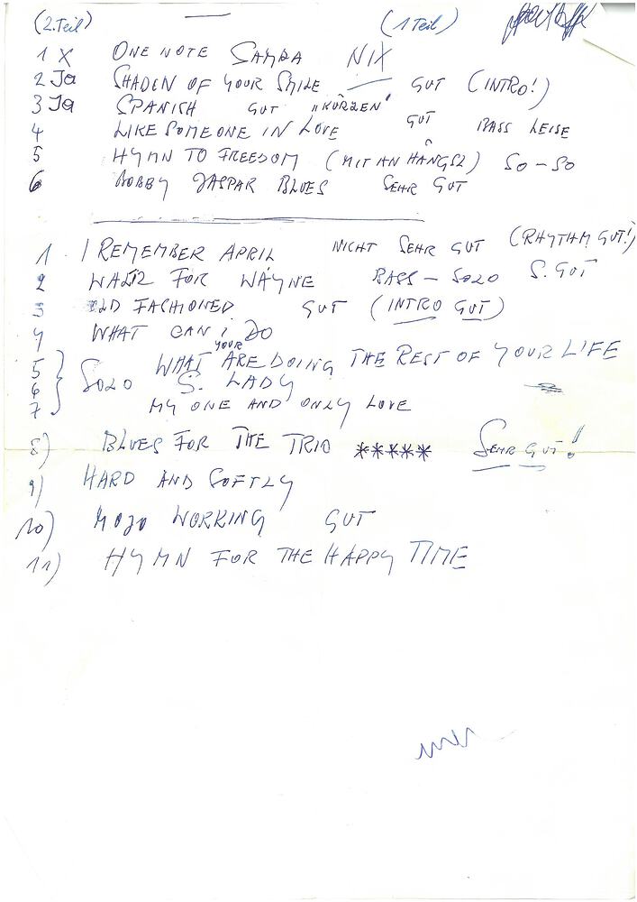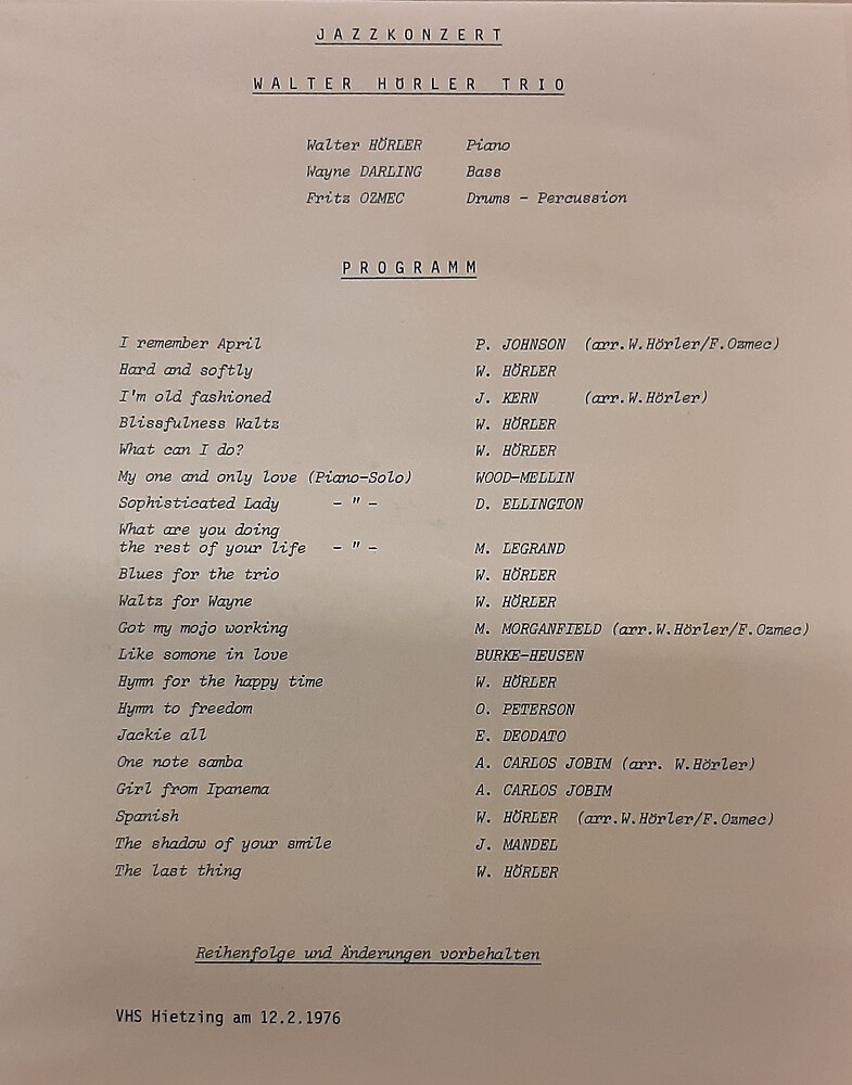 Mit Freude haben wir daher eine Schenkung von fünf Tonbändern mit Livekonzerten aus dem Nachlass des Jazzpianisten in die Historische Sammlung des Instituts für Musikwissenschaft und Interpretationsforschung aufgenommen.[3] Diese Aufnahmen stellen u. a. relevante Zeugnisse der Wiener Konzertlandschaft und Konzertlebens der 1970er, 1980er und 1990er Jahre dar – wurden zwei der Tonbänder (wahrscheinlich auch ein nicht näher ausgewiesenen dritten) in Wiener Klub Jazzland aufgenommen, sind zwei hingegen Aufnahmen von Konzerte, die in der Wiener Volkshochschule Hietzing stattfanden (am 29. April 1975 und am 12. Februar 1976) und somit eine unkonventionellere und auch politisch konnotierte Aufführungssituation widerspiegeln.[4]