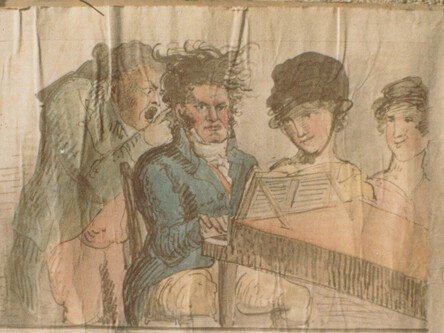 Beethoven am Flügel, umstanden von Antonio Salieri (l.), Anna Maria Erdödy und Dorothea von Ertmann, aquarellierte Zeichnung, wohl von Adolf Fischer