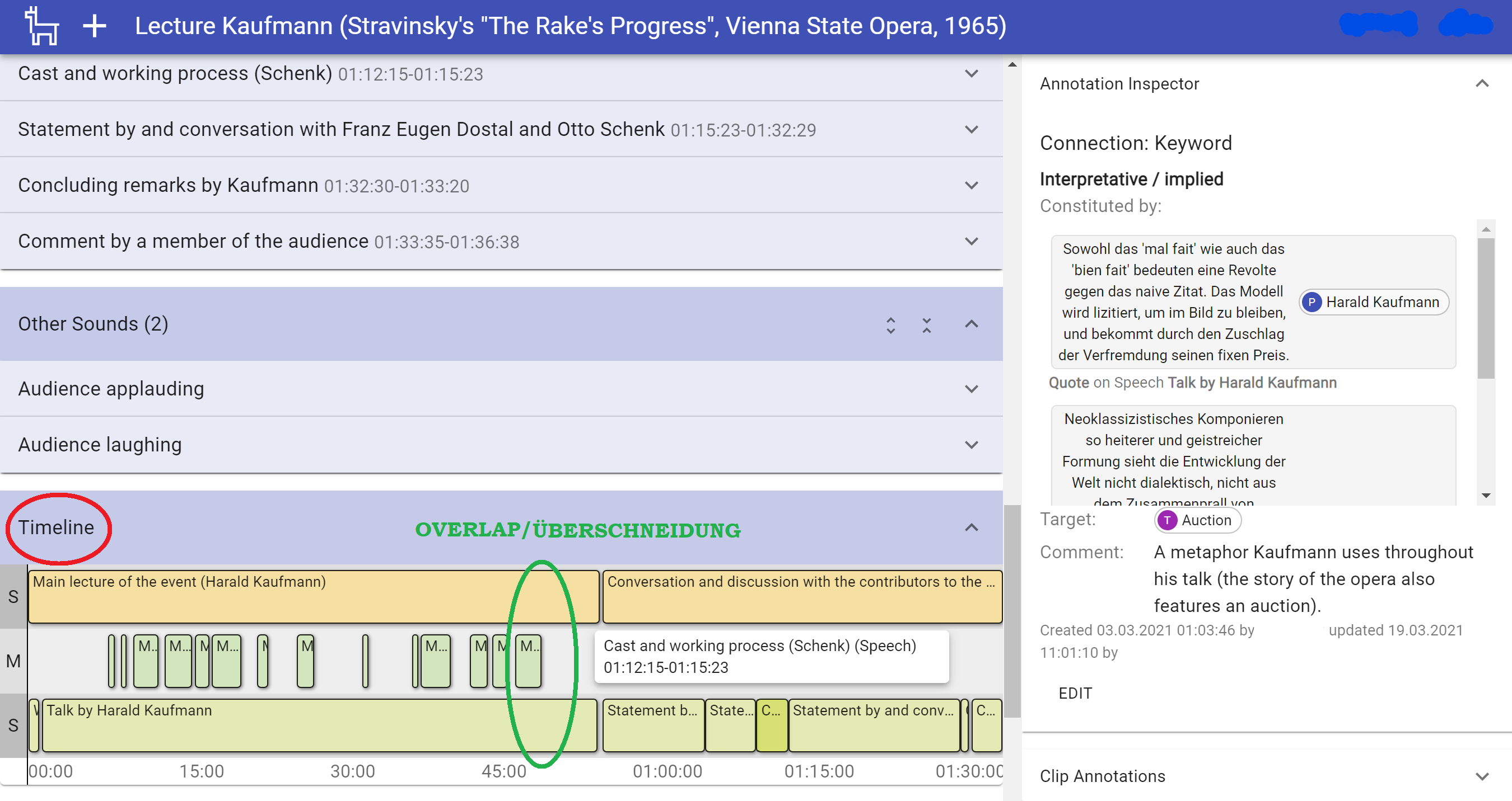 To provide a better overview of the different clips and findings the developers integrated a visual aid. Every section that was assigned a timecode can be depicted on a timeline. This enables the researcher to identify at a glance which annotations (for instance specific sounds, a certain piece of music or language) overlap in a certain clip. Simultaneousness is therewith easy to discern and one can easily spot intersections (see figure 1)