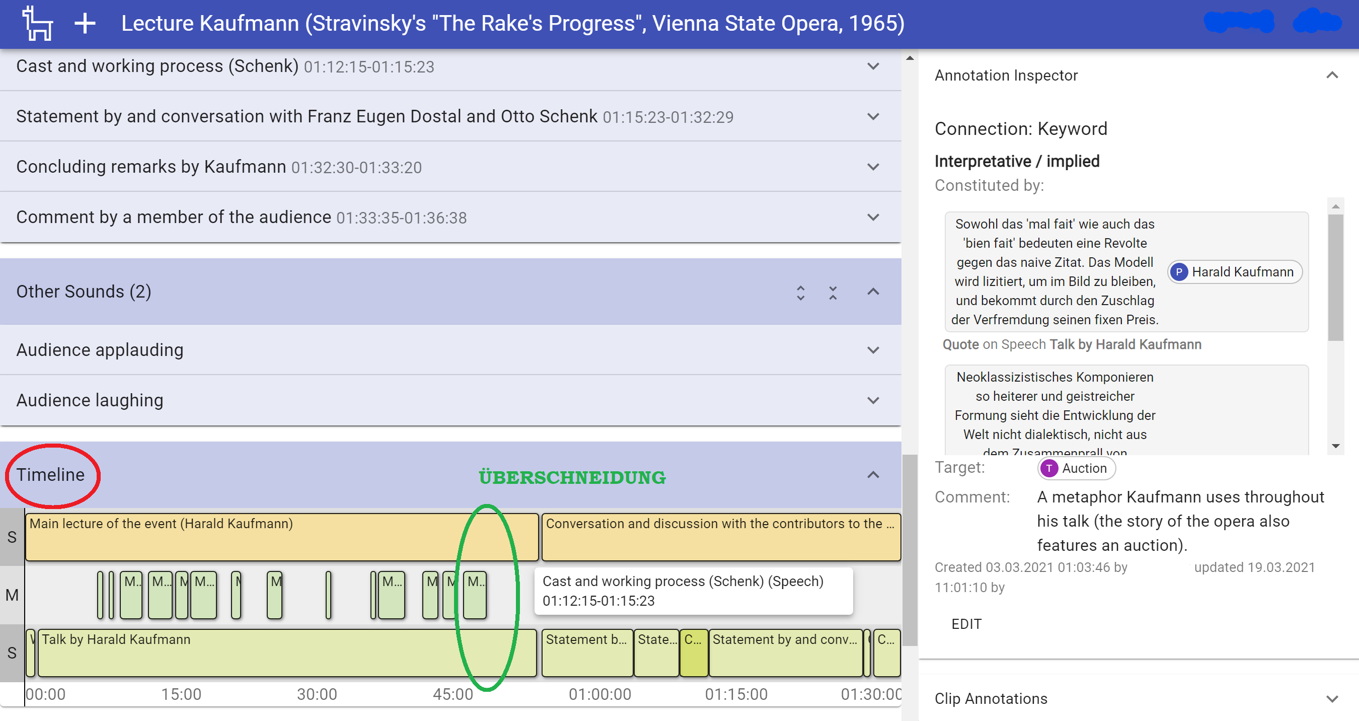 Eine Besonderheit des Tools stellt die Möglichkeit dar, komplexe (Ab)Fragen zu stellen. So kann beispielsweise danach gefragt werden, welche Entities gemeinsam vorkommen oder welche Themen mit Musik unterlegt wurden. Die Recherchen zu spezifischen Forschungsfragen wird so ungemein erleichtert und es kann deutlich mehr Material in Hinblick auf das eigene Forschungsintresse in viel kürzerer Zeit durchsucht werden. Um eine bessere Übersicht zu bekommen wurde zudem daran gearbeitet, die Eingaben auch visuell aufzubereiten. So können all jene Ausschnitte, welche einen Timecode erhalten haben auf einer Timeline dargestellt werden. Dadurch ist auf einen Blick zu sehen, welche Annotationen - beispielsweise spezifische Geräusche, ein Musikstück, Sprache etc. - sich in einem Clip überlappen. Simultanität wird dadurch sichtbar, man erkennt, was gleichzeitig passiert. Dies lässt Überschneidungen deutlich zu Tage treten (vgl. Abbildung 1)
