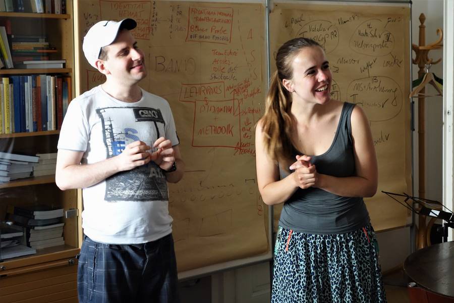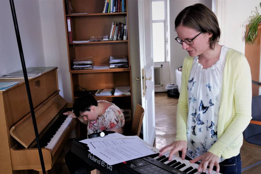 Die Bandmitglieder bekommen vor den Proben jede Woche Instrumental- und Gesangsunterricht von Studierenden der mdw. Momentan werden sie unterrichtet von: