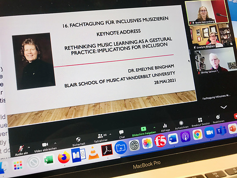 Musik bietet ein reiches Feld, um den individuellen Zugang so zu gestalten, dass den je individuellen Bedürfnissen entsprochen werden kann. So gab Emelyne Bingham von der Vanderbilt University, Nashville, USA, in ihrer Keynote Practicing phonomimetic (conducting-like) gestures facilitates vocal performance of typically developing children and children with autism: an experimental study spannende persönliche und wissenschaftliche Einblicke in ihre Forschungsarbeiten in den Bereichen Gestik, Musik und Autismus. Daraus entwickelte sich eine lebendige Gruppendiskussion, geleitet und übersetzt von Shirley Salmon, Mozarteum Salzburg. Binghams Vortrag wurde in deutscher Übersetzung sowie in Leichter Sprache für Teilnehmende mit Lernschwierigkeiten zur Verfügung gestellt.