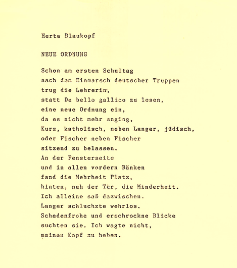 In addition to her academic and journalistic publications, Herta Blaukopf left an extensive literary corpus, which, according to our current knowledge, has never been published. The collection amounts to approximately 40 texts pertaining to a great variety of genres, such as drama, poetry, short story, novel, radio play, dialogue or monologue.