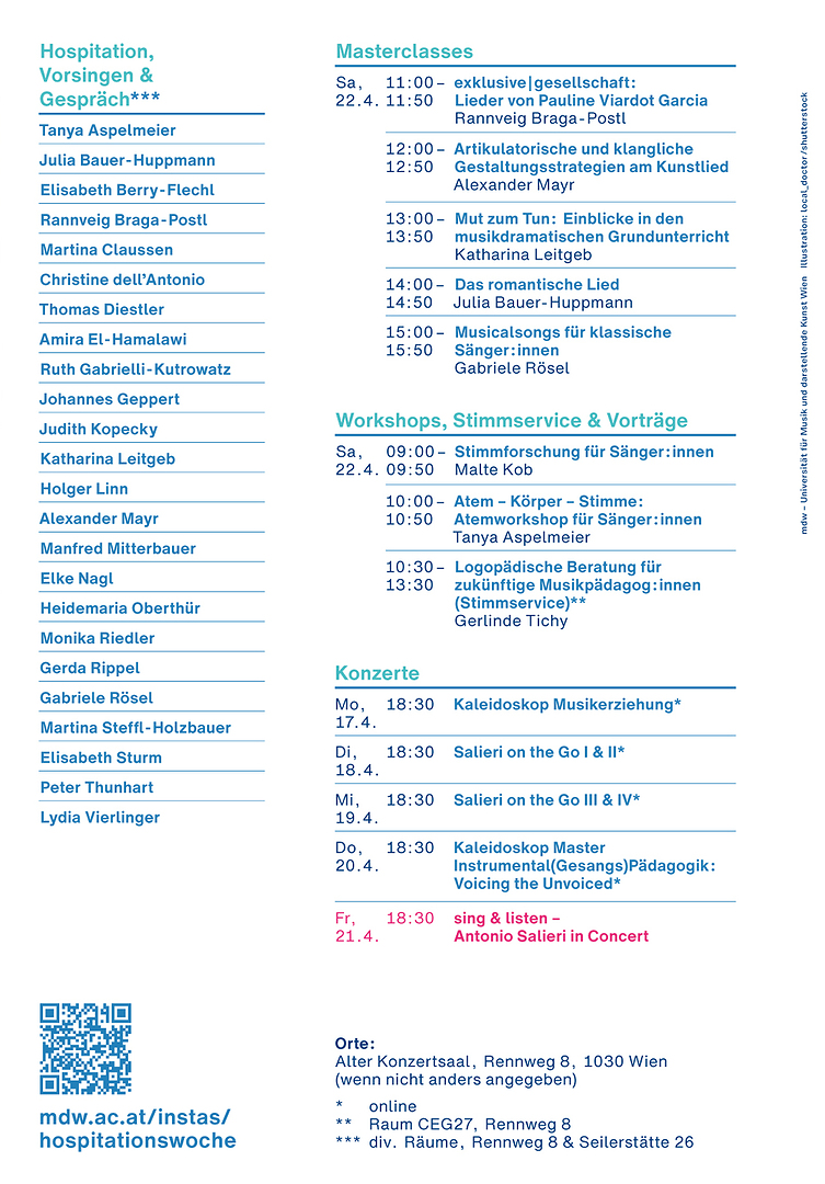 Anmeldungen für die Masterclasses, Workshops und Stimmservice erfolgen bis 12.04.2022 ausschließlich unter: salieri@mdw.ac.at (+43 1 71155 DW 4701)