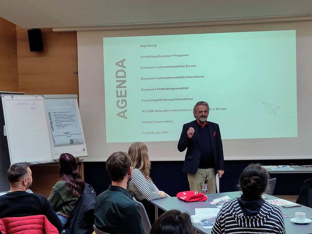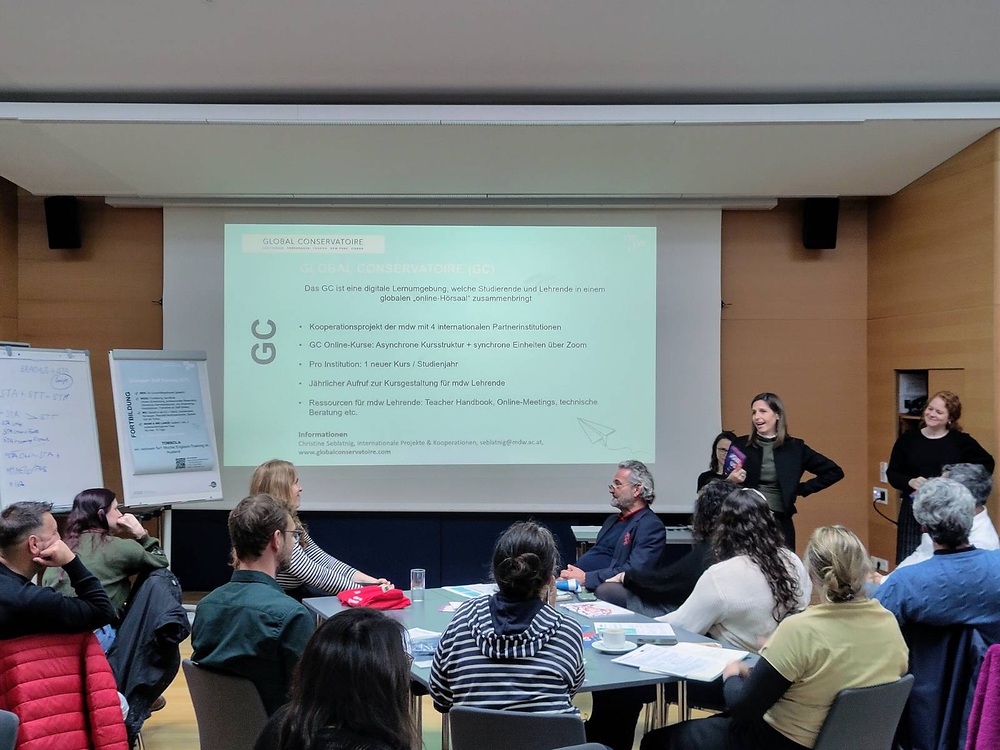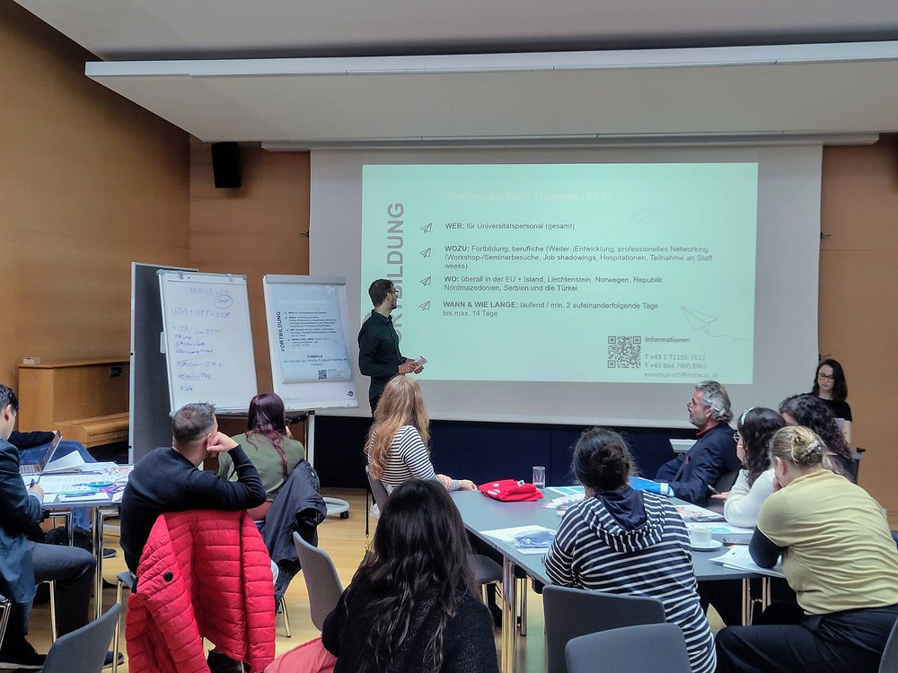 Am 15.10.2025 fand unsere Erasmus+ Infoveranstaltung, bei der Mitarbeitende des administrativen Personals sowie Lehrende sich über die vielfältigen Austauschmöglichkeiten, die es an der mdw gibt, informieren konnten. Im Anschluss an kurze Präsentationen über Lehrendenmobilitäten (in Europa & darüber hinaus), Fortbildungsmobiltäten, Forschungsförderung international, IN.TUNE sowie das Global Conservatoire gab es die Möglichkeit, detailliertere Informationen von den jeweiligen Ansprechpersonen zu erhalten sowie Fragen zu stellen.