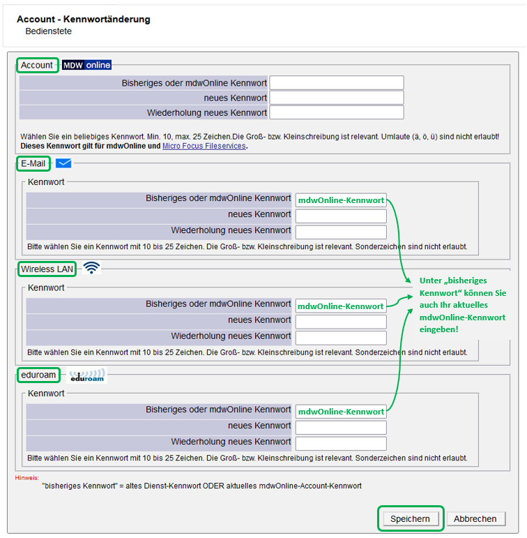 Mit der Applikation "Kennwort ändern" können Sie für mdwOnline, E-Mail, WLAN oder eduroam Kennwörter vergeben und ändern. Die Kennwortvergabe funktioniert NICHT auf Smartphones oder Tablets. Verwenden Sie einen Mac oder PC! Die von mdwOnline unterstützten Browser sind Firefox und Chrome. Apple's Safari-Browser wird nicht unterstützt.