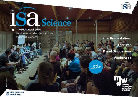 isaScience 2014, findet vom 11. bis zum 15. August im Schloss Reichenau (Reichenau an der Rax/NÖ) im Rahmen der isa - Internationale Sommerakademie der mdw - Universität für Musik und darstellende Kunst Wien. Die isaSience sieht sich als Forum für eine offene wissenschaftliche Community, Thema der isa 2014 ist "Zeitenwenden / Times of Change".