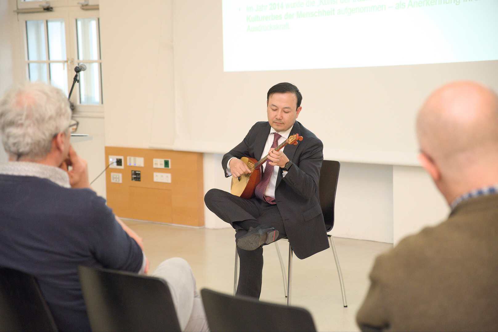 Auf der Dombra trug Herr Nareimov drei Küjs vor, also narrative Instrumentalkompositionen: Erke Sylkym von Abdimomyn Zheldibayev (*1934) sowie Balbyraun und Adai von Kurmangazy Sagyrbaev (1823–1896). Für nicht wenige der zahlreichen Gäste war dies eine erste Begegnung mit der ungewöhnlichen Spielweise des Instruments mit seiner differenzierten Anschlagstechnik und der kontrastreichen Stimmführung. Eine besondere Überraschung war die Anwesenheit von Gästen aus Kasachstan, darunter der Dombraspieler Askar Araibek vom Kasachischen Kurmangazy-Nationalkoservatorium Almaty, den der Referent spontan auf die Bühne einlud, um weitere Stimmungen und Spieltechniker der Dombra zu demonstrieren.