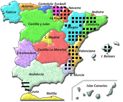 Strict parallel singing in intervals of thirds is not characteristic of a specific region in Spain but a general trend that can be found all over the country. For this reason we do not show this phenomenon on the map. We have marked on the map the regions where the forms of multipart singing are more complex, specifically: