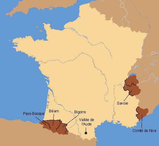 - A West to East geographical continuum with northern Basque country - Basque language -, Béarn and Bigorre - Occitan language - (2 departments)