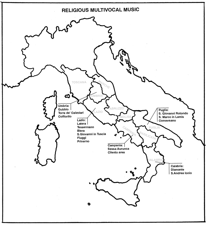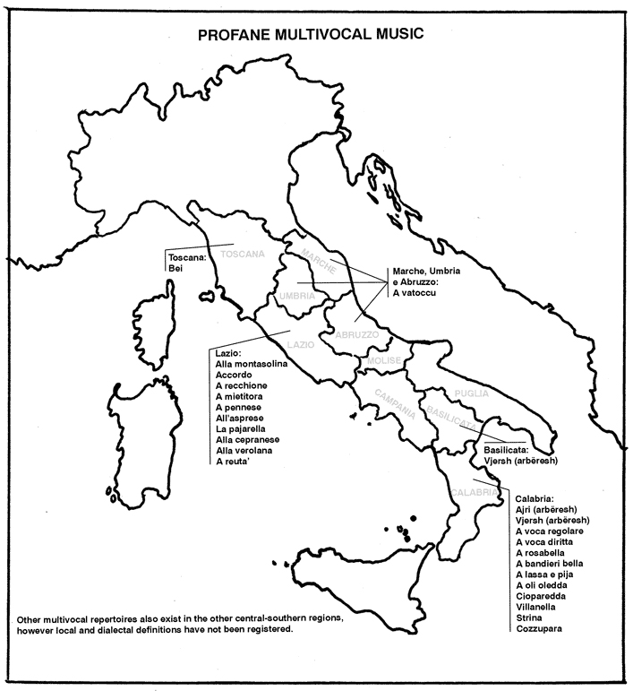 Multivocal singing is diffused - with similar characters and many local versions - all over Central and Southern Italy. We can distinguish two principal fields: religious multivocal music and profane multivocal music. The first one is played mainly by specialized brotherhoods who sing ritual songs, especially during Holy Week; the second one is played by acknowledged groups of singers, during many different ceremonial and everyday occasions.