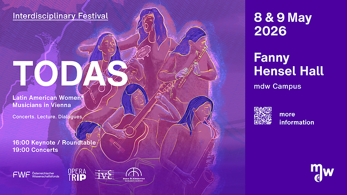 Konzerte mit sechs herausragenden zeitgenössischen Musikerinnen* aus Wien, die aus verschiedenen lateinamerikanischen Ländern stammen und in unterschiedlichen Musikgenres tätig sind, werden am ersten Tag durch eine englische Keynote der Ethnomusikologin Sydney Hutchinson (Berlin) ergänzt. Der zweite Tag beginnt mit einer Podiumsdiskussion unter dem Titel „Latein-amerikanische Musikerinnen* in Wien: Sichtbarkeit, Anerkennung und Präsenz auf der Bühne", bei der Wissenschaftlerinnen* und Musikerinnen darüber diskutieren, wie den verschiedenen Stereotypisierungen und gelebten Realitäten lateinamerikanischer Musikerinnen* in Wissenschaft und Musik begegnet werden kann. Mit TODAS wollen wir eine Lücke in der Sichtbarkeit und Anerkennung dieser Diaspora schließen – nicht nur in Wien, sondern auch innerhalb der akademischen Musikforschung.